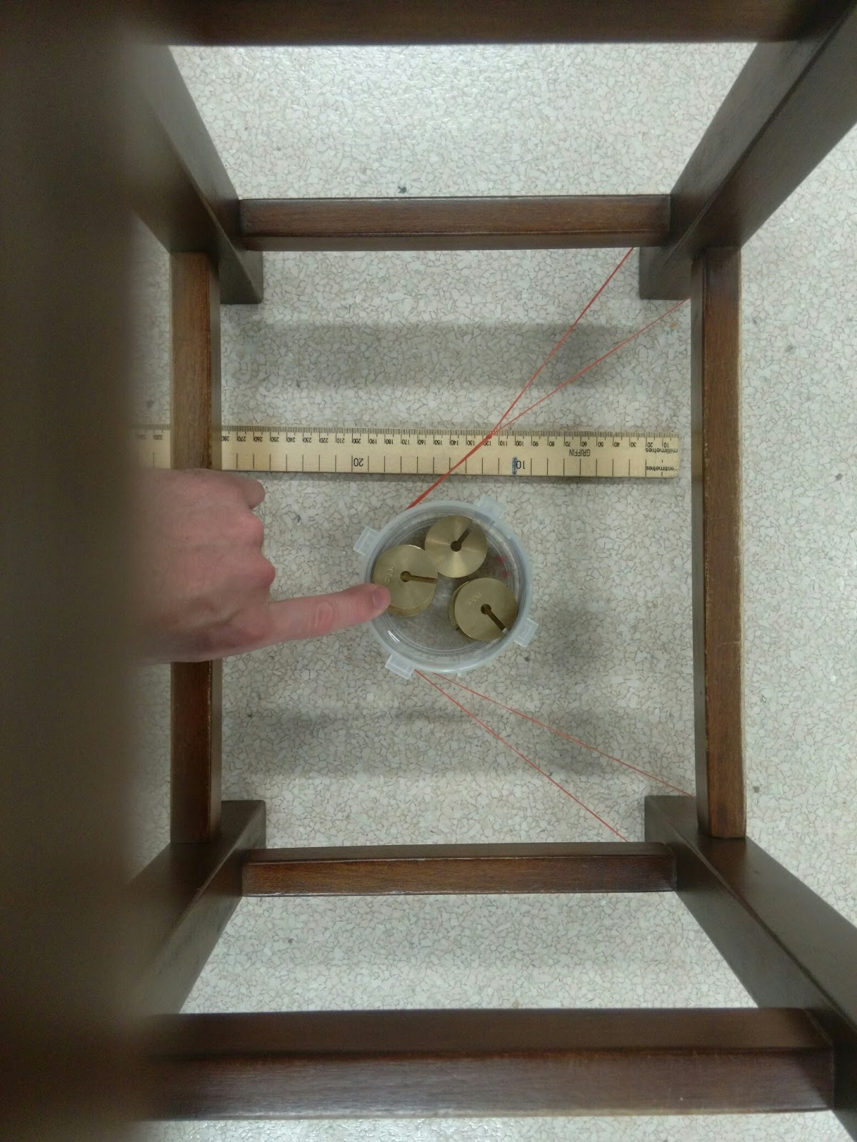 In the second stage, the rubber band is released and is going back to its original straight position. In this stage, the potential energy of the rubber bands is transferring into two energy: the kinetic energy of the tub and the work done by friction between the tub and the floor. How does the mass of the tub affect the work done by friction? The equation to calculate the work done by friction is f × d, the frictional force times the distance the object travels. The distance the tub, heavy or light, travels when the rubber band went from a pulled-back position to a straight line is a fixed value. The heavier of the two tubs is going to have more friction than the less heavy tub as it has more mass. As a result, the work done by the friction of the heavier tub is larger than of the lighter tub. To find the relationship between the kinetic energy of the two tubs, we can have the following equations: ∵ P1 = P2, ∴ K1 + W1 = K2 + W2, where K1 and W1 are the kinetic energy and the work done by the friction of the lighter tub and K2 and W2 are of the heavier tub. As W1 < W2, K1 > K2.